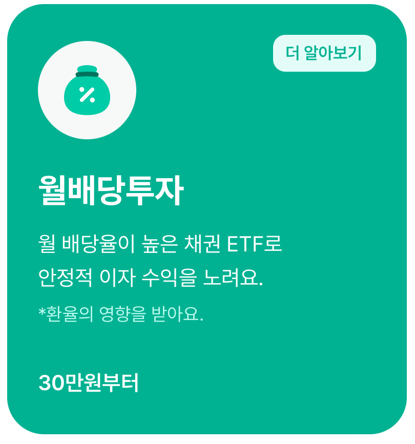 월배당투자는 배당률이 높은 달러채권을 구매해 이자 수익을 챙긴다. 특징으로는 달러로 환전하여 미국 채권을 구매한다. 그래서 환율의 영향을 받는다. 환율이 오르길 기대해야 한다. 월배당투자의 YTW는 5%~6% 사이정도 된다. 이 역시 수수료는 기본수수료만 있는 듯하다.