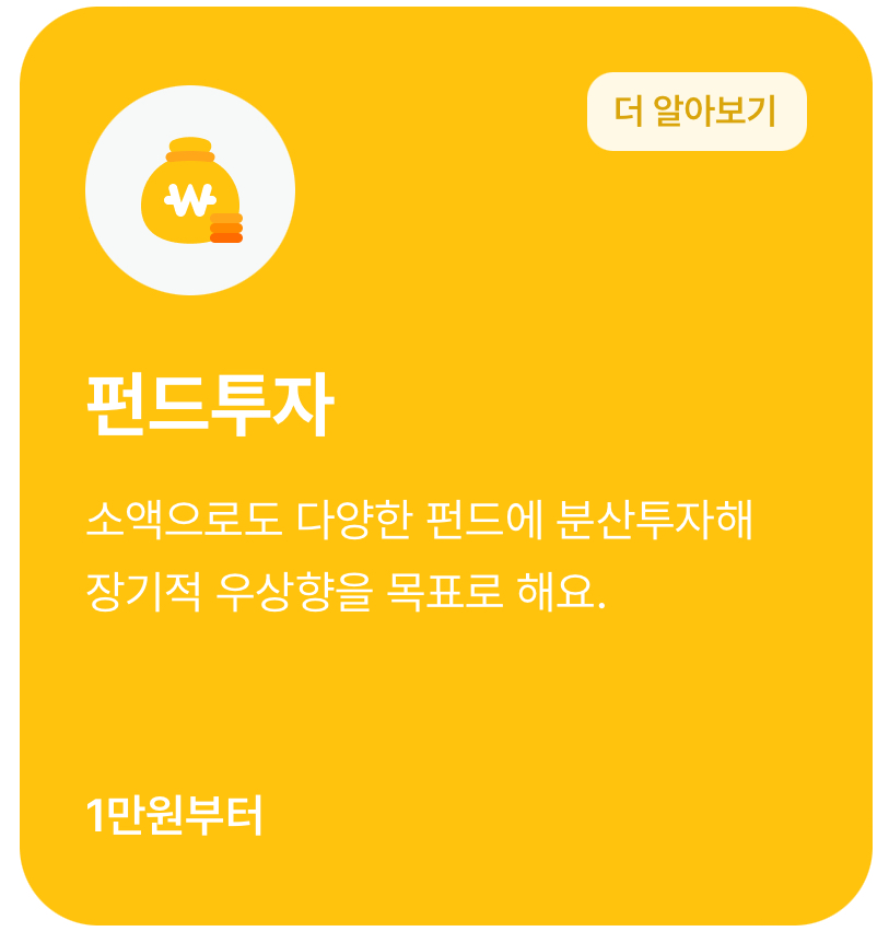 펀드투자는 무려 1만 원이라는 소액으로 시작가능한 투자다. 다양한 펀드에 분산투자를 목적으로 하는 듯하다. 최근에 생긴것 같은데, 왜인지는 모르겠지만 최근 3개월 수익률 지표가 존재한다. 2%~7% 정도 수익을 낸 듯 하다.