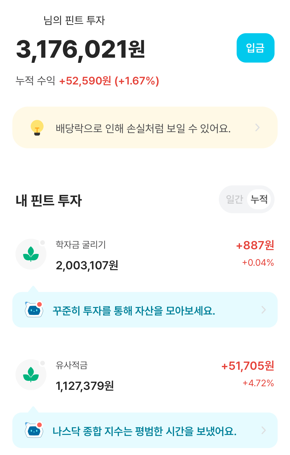 최근에 학자금을 모아뒀던 예금통장이 만기가 되어 핀트의 월배당투자(미국채권)에 돈 일부를 넣고 굴리기로 결정했다. 한 1년 정도 지켜보면 그때 수익이 얼마가 되어 있을지 궁금하다. 앞으로 여윳돈이 생기면 조금씩 핀트에 넣어서 굴릴 것 같다.