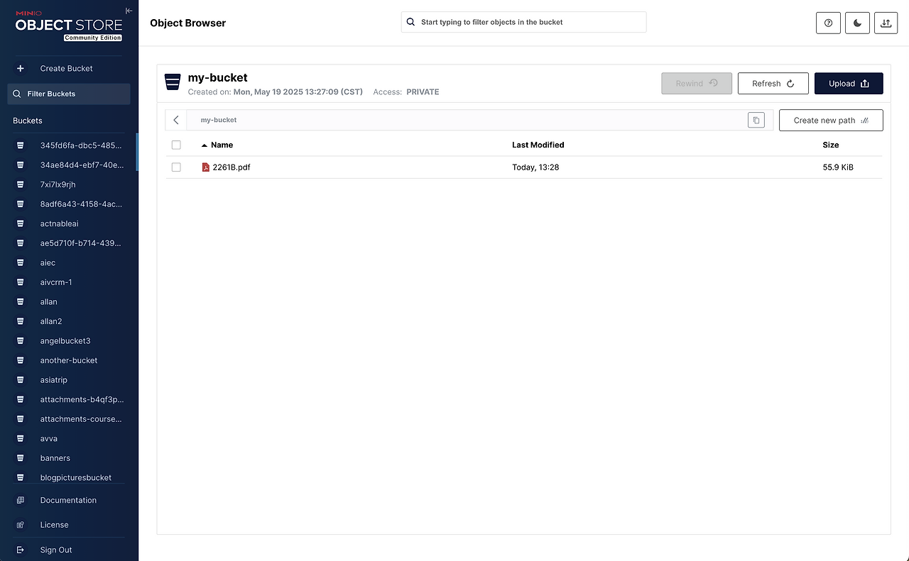이를 통해 손쉽게 MinIO 클러스터를 관리하고, 오브젝트 브라우저 기능을 통해 클러스터에 파일을 업로드하고 다운로드 받을 수 있습니다.